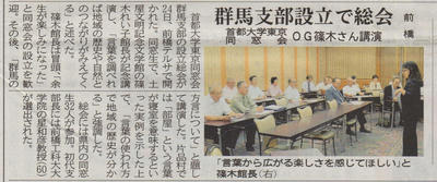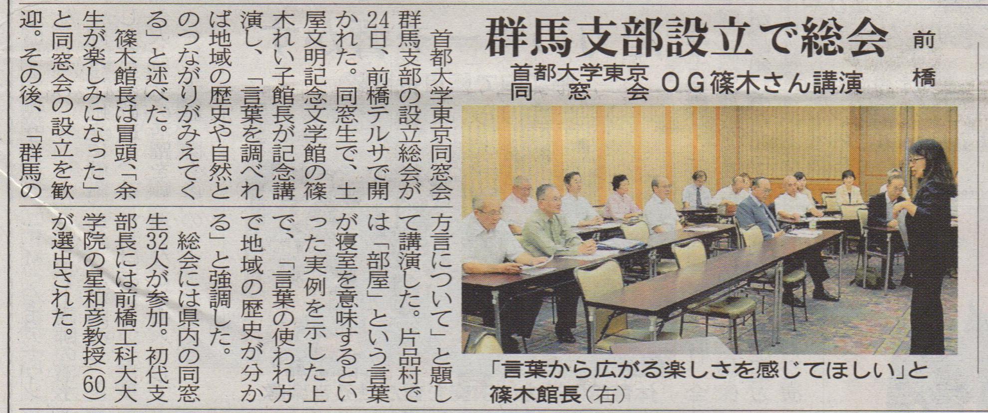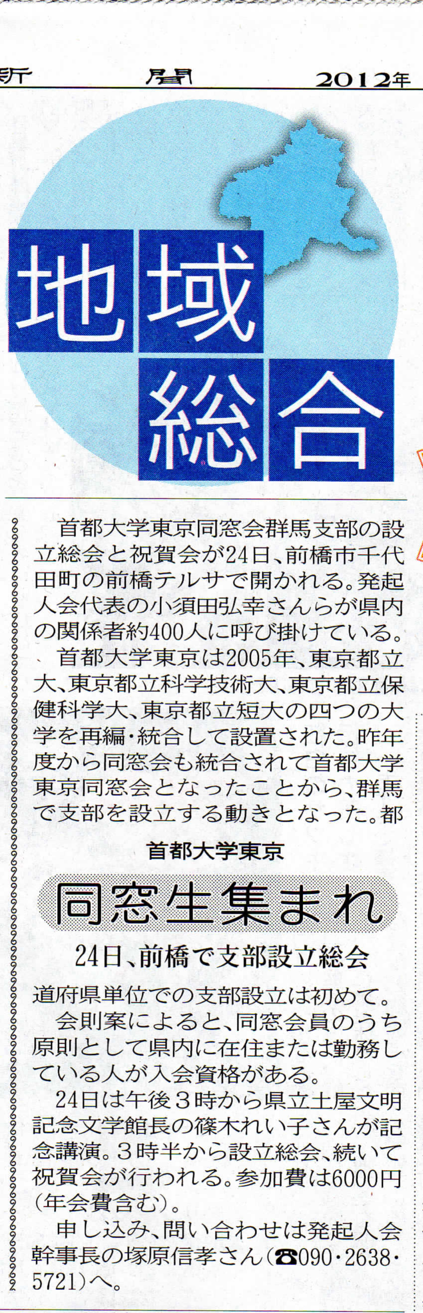 6/9の上毛新聞に、首都大学東京群馬支部設立総会の記事が掲載されました。同窓会本部が把握できている群馬県に関わりのある同窓生に案内状を発送しましたが、名簿外の数人の同窓生から出席したい旨の連絡を頂きました。