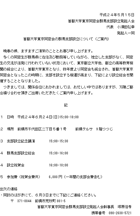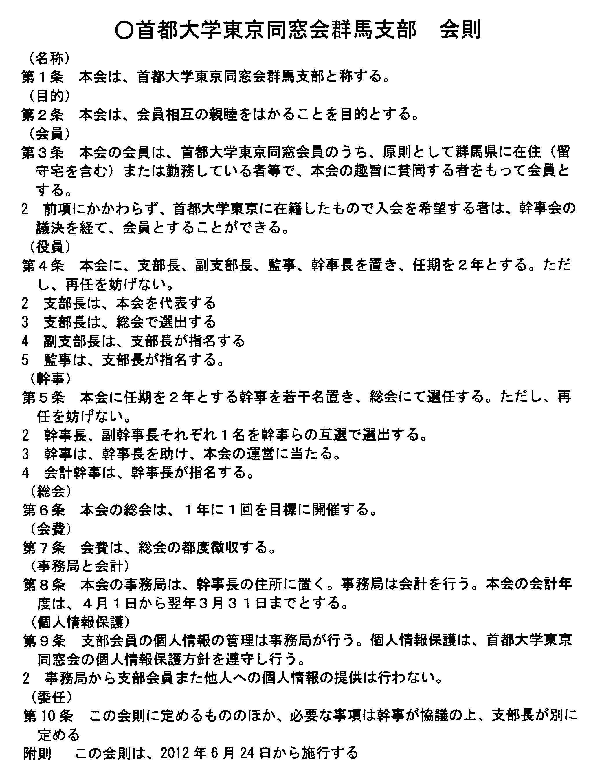 さて、下記に会則を添付いたしますが、群馬支部の会員は、規約にもありますように、「都大学東京同窓会員のうち、原則として群馬県に在住(留守宅を含む)または勤務している者等で、本会の趣旨に賛同する者」等です。今回の設立総会に出席できなかったけれど群馬県支部の会員となる方は、下記にお問い合わせいただければ、口座等必要な情報を提供させていただきますので、ご連絡ください。